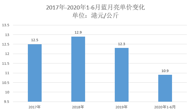 那么蓝月亮毛利率的提升是因为产品提价还是成本下降呢?《投资者网》进一步分析获知,2017年-2020年6月,蓝月亮产品单价总体呈下降趋势,由12.5港元/kg降至10.9港元/kg。