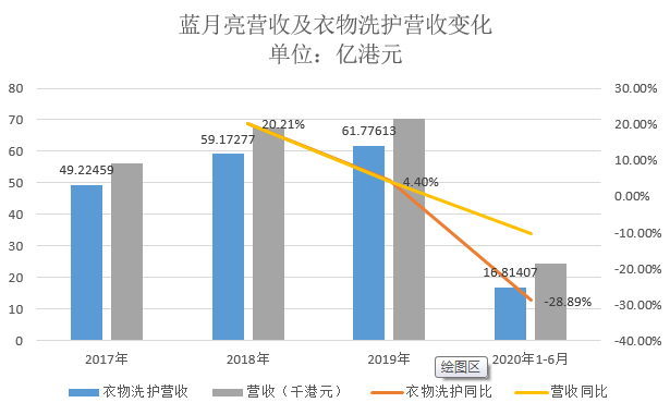 对此,《投资者网》在蓝月亮的销售数据中也找到了端倪。2019年,蓝月亮总营收增速已跌至个位数,2020年上半年受疫情冲击更陷入负增长,同期其占比最高的衣物洗护(主要包括洗衣液、浓缩洗衣液)收入增速于2019年下降至4.4%,2020年上半年下降至-28.89%。