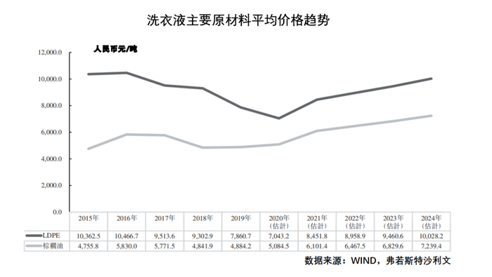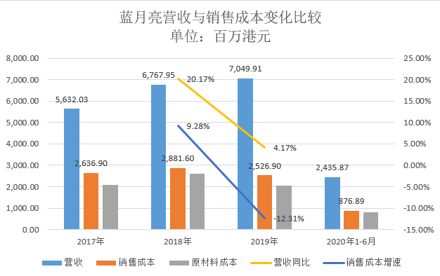 为何销售成本会出现大幅下降呢?蓝月亮在招股书中披露,公司销售成本占比最高的是原材料成本,即生产洗衣液所用由棕榈油提炼的化学品以及洗衣液包装袋的主要成份LDPE,2017年-2020年6月,两者合计占蓝月亮销售成本的比例为90.6%、81.5%、76.4%及93.3%。