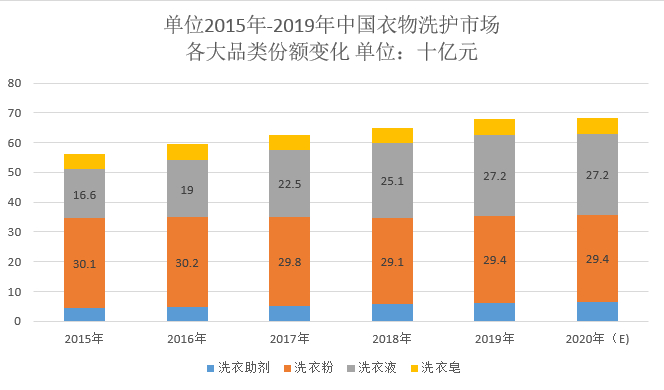 另一种回答是:不是,因为蓝月亮领先的洗衣液、浓缩洗衣液、洗手液细分市场只是按供给端出发划分的,但对于消费者而言,“液、粉、皂、凝珠”都能满足他们的清洁需求。