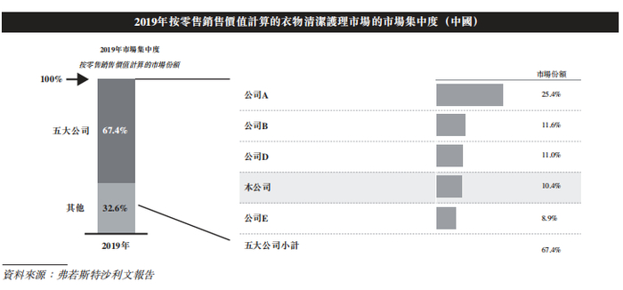 弗若斯特沙利文的报告显示,占蓝月亮营收超八成的洗衣液2015年-2019年中国零售销售价值的复合增长率为13.1%,并预测未来随着“液替粉”的继续及中国洗衣液品类渗透率向发达国家的看齐两大利好,中国洗衣液市场于2019年至2024年的复合增长率将达到13.6%。