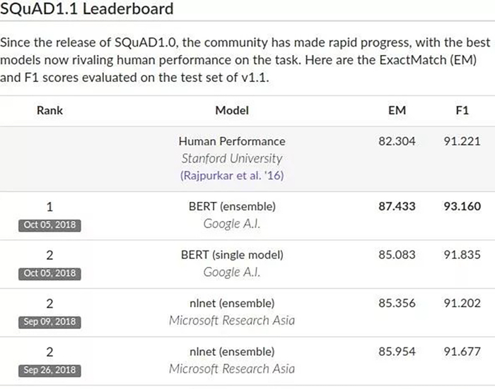 BERT最出圈的“荣耀时刻”是2018年:称霸机器理解测试SQuAD,横扫其他10项NLP测试,达成“全面超过人类”成就。