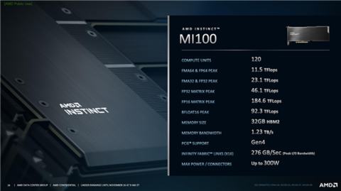 相比目前RX 6900 XT最多80组CU核心,Instinct MI100加速卡集成了120组CU单元,7680个流处理器,搭配32GB HBM2,带宽高达1.23TB/s,同时支持PCIe 4.0,集成Infinity Fabric x16高速互联通道,峰值带宽达276GB/s(相当于PCIe 4.0 x16的大约4倍),而整卡功耗控制在300W。