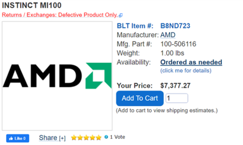 性能是很高,价格呢?此类产品由于主要供应给商业客户,AMD及NVIDIA都不会公布零售价,不过Shopblt网站日前开始预售Instinct MI100加速卡,给出的价格是7377.27美元,约合4.8万元人民币。