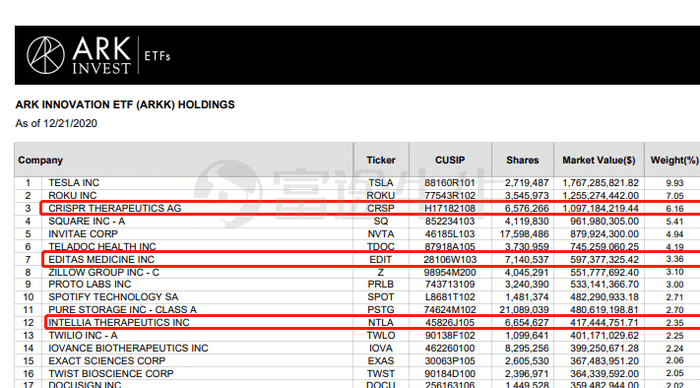 CRISPR Therapeutics 是 $ARK Genomic Revolution ETF(ARKG.US)$ 的最大持股。该基金年初至今上涨183.3%,远远超过了纳斯达克生物技术ETF(iShares Nasdaq Biotechnology ETF)29.2%的收益。