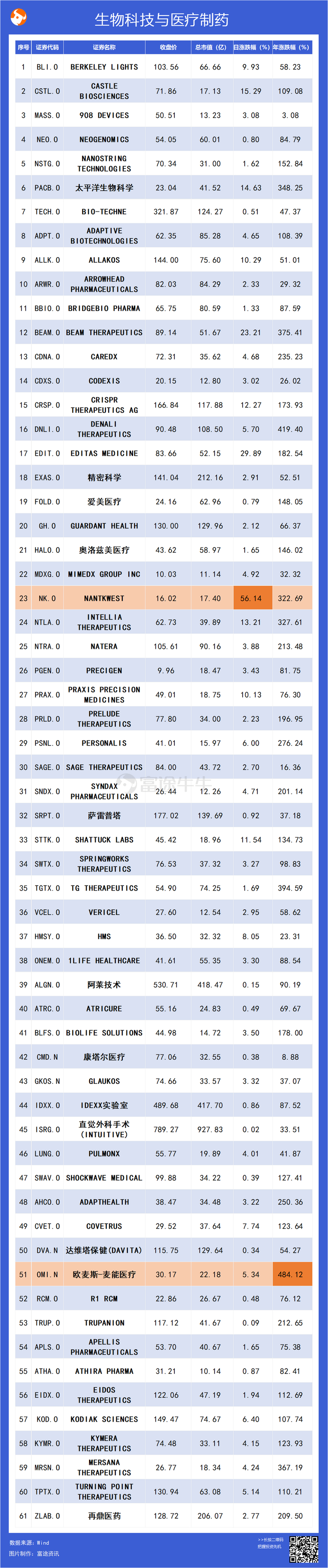 生物科技与医疗制药板块涨幅较高的还有,免疫疗法研发公司 $NANTKWEST(NK.US)$ 上涨56.14%,年涨322.69%。NantKwest周一宣布,已与免疫疗法初创企业 ImmunityBio 达成协议,以换股方式进行合并,创建一家集合免疫疗法及细胞治疗的公司。