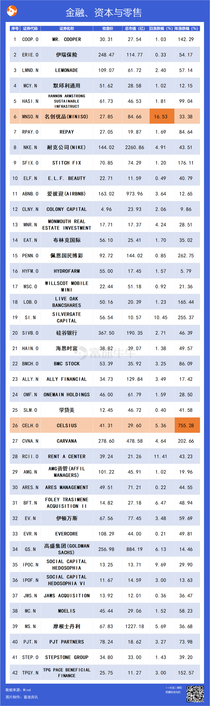$名创优品(MNSO.US)$ 上涨16.53%,年涨33.38%。