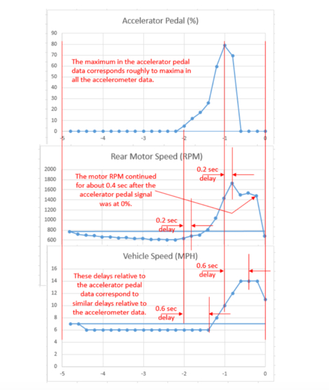 有趣的是,即使在碰撞发生前半秒钟,油门踏板的读数变为零,车辆的纵向(向前)加速度仍会继续增加,直到车辆撞向车库为止。人们会期望在油门踏板读数变为零后,车辆的速度将保持恒定甚至降低,但是当释放油门踏板时,纵向加速度应该停止,甚至随着再生而变为负值。同样,后部电动机速度数据显示,即使松开油门踏板,驱动电动机的速度仍保持较高。这表明在碰撞时驱动马达仍在产生扭矩以使车辆向前加速,这在松开油门踏板后超过半秒。
