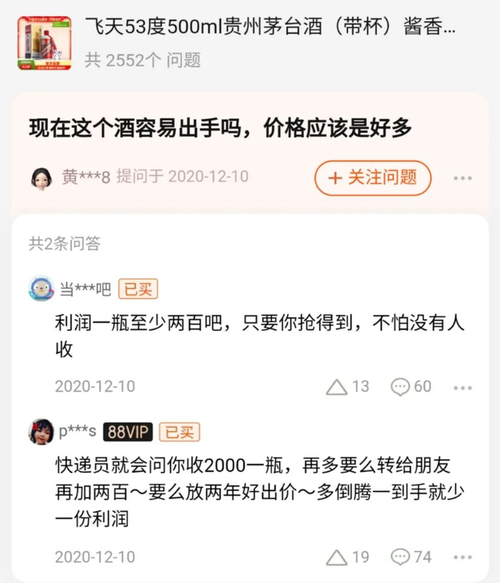 查看天猫超市53度飞天茅台购买页面发现,评论区中讨论话题大多为“如何出手、市场行情如何”等问题。另有网友评论称,有快递员送货时会提出2000元/瓶收货,只要抢到不怕没人收。