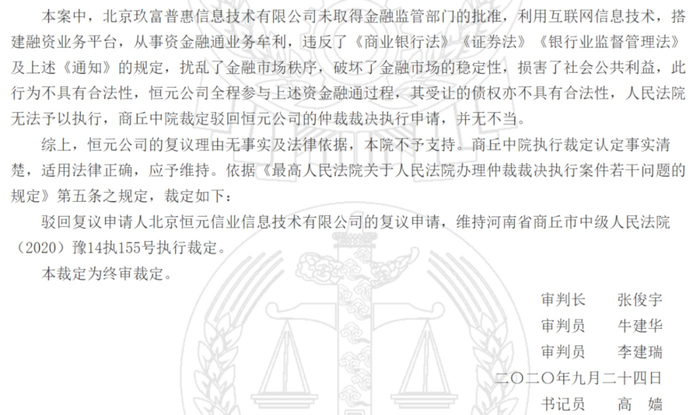 不管已经立案的消息是否真实,12月11日河南省高院关于玖富一案的判决书已经认定玖富普惠是无资质非法放贷。