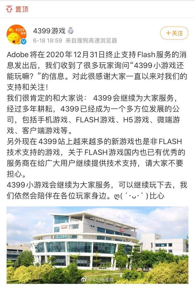 2020年6月,Adobe表态将终止支持Flash服务时,4399游戏就在其置顶微博中回复,会继续为大家提供服务。