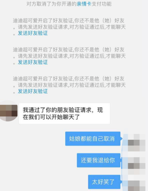 这时女孩恼羞成怒开骂,“你**不早说,找别人我早买了。都**怪你,买个屁啊。”随后,女孩取消了为卖家开通亲情卡的支付功能。卖家也回复,“姑娘都能自己取消,还要我退给你,太好笑了。”此后,女孩将卖家拖黑。