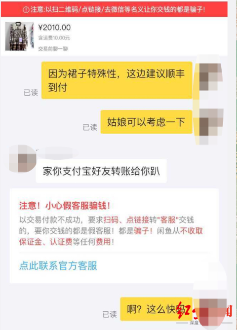 第一,在最开始双方短暂的闲鱼交流中,闲鱼软件一直弹出防骗提醒,“注意,小心加客服防骗。以交易付款不成功,要求扫码、点链接转“客服”交钱的,要你交钱的都是假客服。”卖家以为是女孩没有认证的原因,女孩以一个问号敷衍过去。