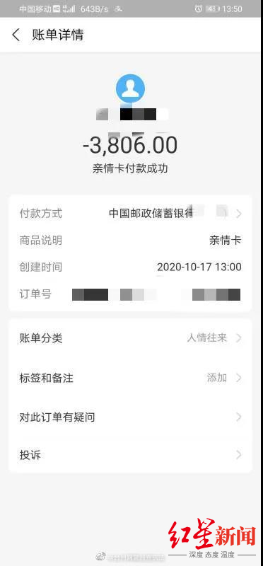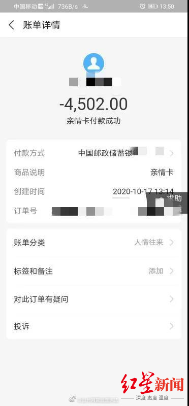 紧接着在转账的环节,女孩向卖家发出一张亲情卡,显示额度为2000元。
