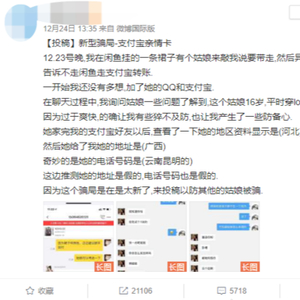 12月24日,有网友通过微博报料,自己在闲鱼二手交易平台出售商品时,险些被买家诈骗的一幕——通过闲鱼二手交易平台搭讪,以急用为由要求卖家通过支付宝交易,支付方式不是直接转账而是假意错发支付宝亲情卡功能,要求卖家发还亲情卡。最终,骗子露出的马脚,让卖家产生质疑没有上当。