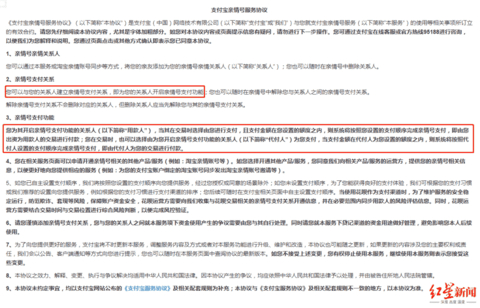 在支付宝官网的相关协议中介绍,“您可以与您的关系人建立亲情号支付关系,即为您的关系人开启亲情号支付功能。当其在交易时选择由您进行支付,且支付金额在您设置的额度之内,则系统将按照您设置的支付顺序完成亲情号支付,即由您出资为用款人的交易进行付款。”