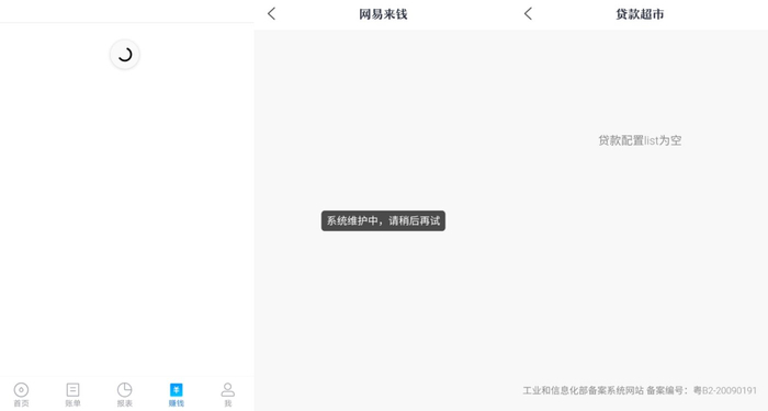 笔者登录该APP后发现,网易有钱的部分功能确实已经停摆。除基本功能之外,“赚钱”板块目前已经无法加载出任何内容。个人板块仍有网易来钱和贷款超市两个网易旗下服务可供链接,初登录时还能看到网易来钱的贷款额度,但很快就被“系统正在维护”页面取代;至于贷款超市,其早已显示“贷款配置list为空”,也没有其他的可操作界面。