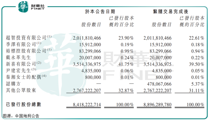 本次收购事件对中国地利股权架构并没有造成太大影响。从公告看,新喜有限公司和超智投资仍是公司第一大和第二大股东。