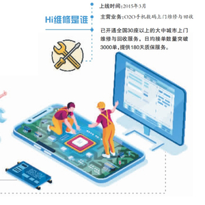 苹果合作的Hi维修于2015年3月正式上线,主营O2O手机数码上门维修与回收,现已开通全国30座以上的大中城市上门维修与回收服务,全部垂直管控模式,日均接单数量突破3000单,平台入驻合格工程师超过600人,提供180天质保服务。有报道称,Hi维修于2016年3月获A股上市公司恺英网络提供的3000万元A轮融资,2017年6月获得来自恺英网络领投的5000万元A+轮融资。