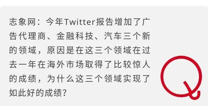 蓝伟纶:今年的报告关注范围扩宽至六大领域,深度聚焦:科技、游戏、移动互联网、汽车、金融科技和广告代理商,并针对不同行业展开案例研究,分享中国品牌是如何成功利用Twitter独特优势,与海外接受度最高的目标用户建立连接和互动。报告引入的三个最新领域也展示出Twitter敏锐的行业洞察力——这三个领域在2020年展现了惊人的增长速度,同时越来越多的此类中国企业开始在激烈的海外市场竞争中脱颖而出。
