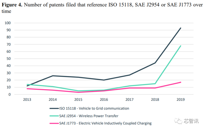 IPlytics统计了自2013年以来,有引用WPC这三个与电动汽车无线充电最为相关的标准的无线充电专利。根据IPlytics统计数据显示,自2018年以来,与ISO15118、SAE J2954、SAE J1773标准相关的专利申请量出现了快速增长,但是数量仍很少。