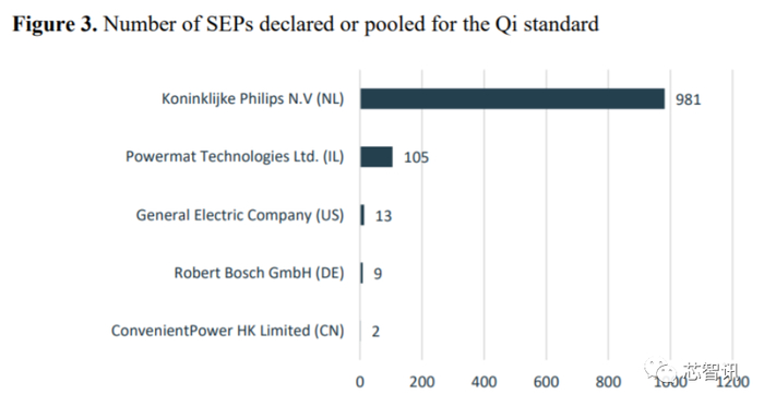 而在Qi标准当中的已声明的SEPs专利(Standard essential patents,标准必要专利)中,飞利浦以981件SEP专利排名第一,排名第二到五的则是分别是Powermat Technologies(105件)、通用电气(13件)、博世(9件)和ConventPower Limited(2件)。