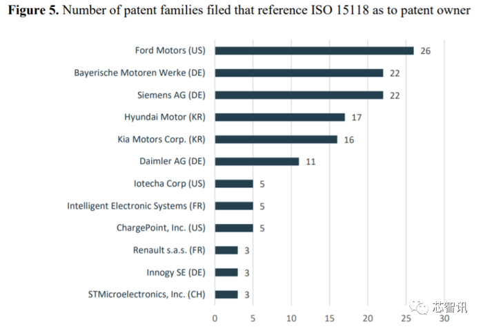 以引用了ISO 15118标准的专利族为例,拥有这些专利数量最多的厂商是汽车制造商,比如排名第一的福特、排名第二的宝马、排名第四的现代。除了汽车厂商之外,还有来自工业制造业、能源行业和半导体行业的公司,比如西门子、Innogy和意法半导体。