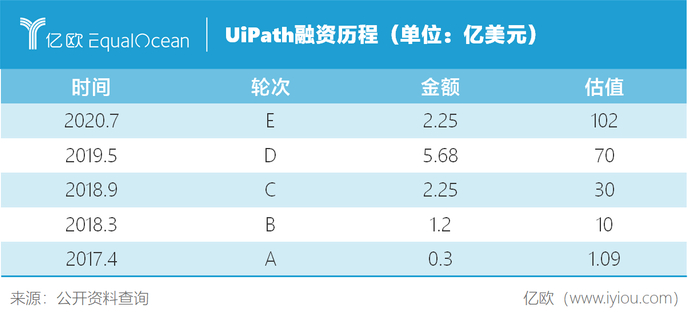 自2017年获得A轮融资开始,UiPath先后在2018年完成B、C轮;2019完成D轮,并在3年时间内从1.09亿估值飙升至70亿美元。即使在深受新冠疫情黑天鹅影响下的2020年,UiPath仍在7月获得2.25亿美元的E轮融资,估值达到102亿美元,成为RPA行业第一家估值破百亿美元和全球发展最快的企业软件公司。