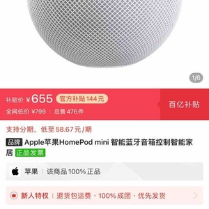 今天,在拼多多的品牌专卖店中,苹果HomePod mini在百亿补贴后仅售655元,相较于官网直降了144元,这也是自发售1个月后的史低价。