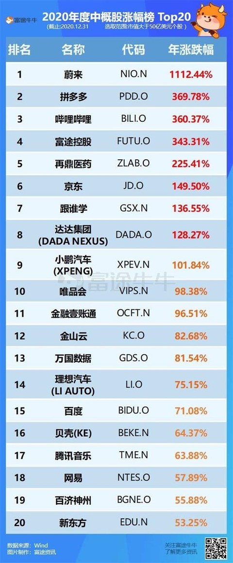 “7亿人都在用”的拼多多,年涨幅则高达370%;而哔哩哔哩、富途控股则分别以360%、343%的涨幅位列第三和第四。