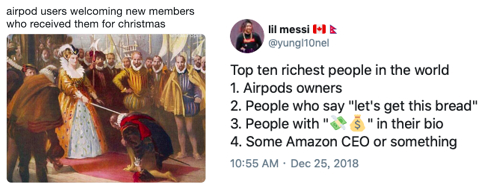 比如AirPods就制造了大量社交网络热梗。以2018年圣诞为例,Twitter等社媒上关于AirPods的很多梗风传;尤其在年轻群体中,拥有AirPods等同富人的梗被反复创作;是非常成功的品宣事件,显著激发了用户的购买欲,成为节日爆品。