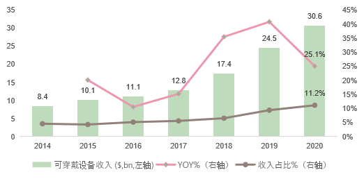 作为苹果家族的“mini”成员,AirPods 对苹果公司的营收贡献不容小觑。2020年苹果可穿戴设备(包括AirPods, Apple TV, Apple Watch, Beats, HomePod, iPod touch 等其他产品)收入过300亿美金,收入占比提至11%。而AirPods和iWatch是绝对的增长主力。