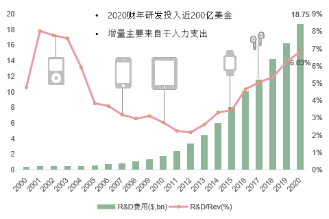 而得以在芯片层面实现创新,背后是苹果持续巨额的研发投入。过去十年,苹果的R&D费用近乎增长10倍。2020财年,其研发投入接近200亿美金,增量主要来自于相关人力支出。