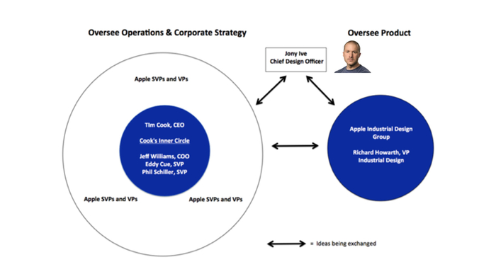 著名的苹果分析师Neil Cybart 17年的旧文曾分析过苹果彼时的领导架构。从下图中可以看到,苹果的领导框架主要分为两部分:运营/公司战略和产品。这种架构在科技公司中非常罕见,工业设计团队有着举足轻重的地位。而Jony作为一个特殊的角色,串联起了这两方。