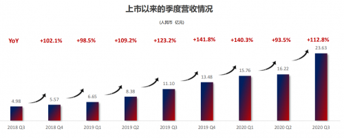 根据Q3财报,1药网上市以来连续8个季度实现近100 %的营收增长。其中,2018年Q3同比增速是100.3%,2019年Q3同比增速123.2%,2020年Q3同比增速为112.8%,这意味着1药网是二级市场极少数穿越3个财年实现连续翻倍增长的上市企业。