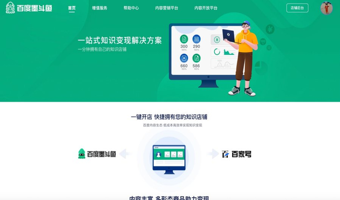 在2021年,百度文库发布投入1亿现金和30亿流量的“乘风计划”,重点围绕提升流量、效率、服务三大领域,助力知识店铺创作者加速变现。首先,百度文库知识店铺上线全新品牌“百度墨斗鱼”,打造一站式知识变现解决方案,支持内容创作者快速开店,并通过开放内容营销服务平台为创作者带来精准投放服务,扩充千亿规模的私域流量提供给平台创作者,这些流量不仅包括百度App、百度文库、百度知道、百度百科、百度网盘等百度移动生态流量,还与外部生态合作伙伴打造内容开放平台,为知识店铺店主聚合更多渠道,进一步扩大分发流量规模。