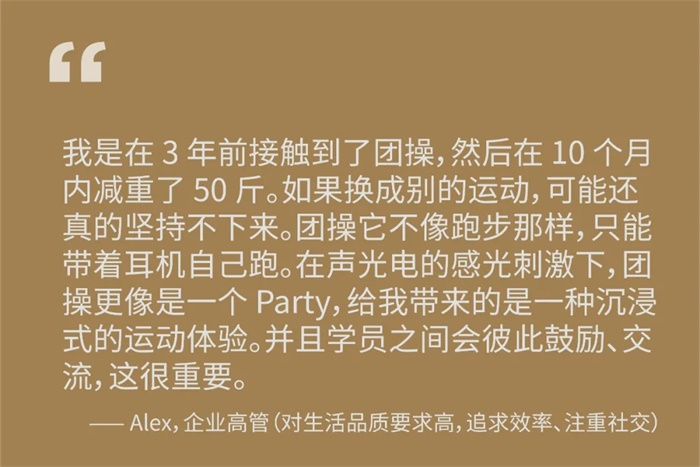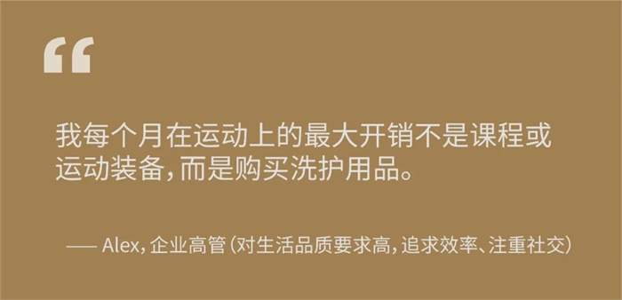 而对于白领人群来说,TA 们个人时间相对较少,生活中更高概率会出现一些不可抗力(如加班、出差、社交活动等)打乱平日的运动习惯。因此,TA 们更倾向于高效灵活的运动方式,如请专业教练进行指导、或是报名参加团体课程。同时,TA 们也不单单只关注运动过程,与运动相关的方方面面如护肤、洗漱、饮食同样被高度重视。