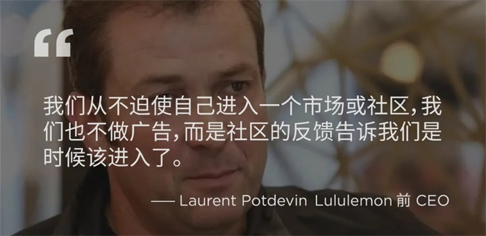 与此同时,Lululemon 采取了社区营销策略(Community-Based Marketing),几乎没有使用明星代言、拍摄电视广告这类常规操作方式。Lululemon 选择的是深入当地的运动社区,结识当地的瑜伽老师、健身教练、运动达人等,让他们担任 Lululemon 品牌大使。借助他们的影响力去构建消费者对品牌的认知,推广自己的产品和品牌文化理念。