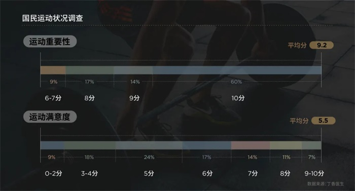 然而对待运动这件事,人们“知”、“行”并不合一。据统计,人们普遍认可运动对于健康的重要性,评分高达 9.2 分,甚至有半数以上的人认为打了 10 分。但人们却对自身运动状态的满意度平均只有 5.5 分。