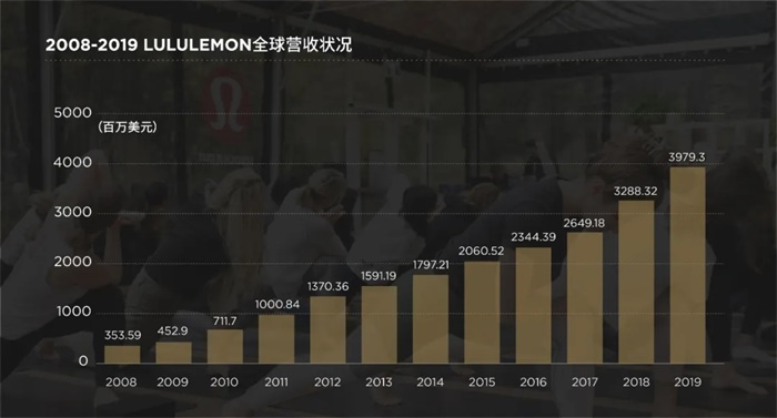 Lululemon 杀出了一条血路,市值一度赶超阿迪达斯,位列全球第二。在去年,Lululemon 全球总营收 39.79 亿美元,同比增长 21%。而疫情期间,当所有运动品牌都遭遇重挫的时候,唯有 Lululemon 逆势而上,市值直逼 400 亿美元。
