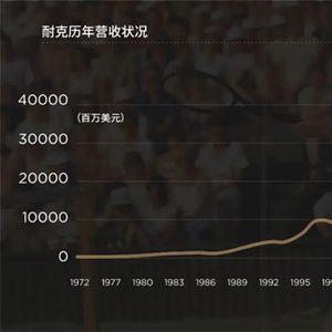 80-90 年代,耐克迎来了第一次的增长瓶颈,销售额一直徘徊在 40 亿美元停滞不前。虽然在 1990 年 11 月,耐克市值达到了最高峰,但自此便开始急转直下。一路下滑近 40%,创始人菲尔所持有的 35%的股票,瞬间蒸发了有 10 亿美元之多。