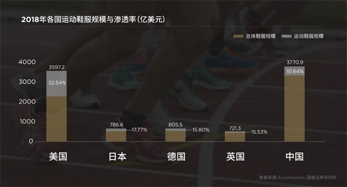 虽然成绩傲人,但耐克大中华区仍有巨大的增长空间。据统计,中国经常参加体育锻炼人数由 2015 年的 3.6 亿,上升至 2019 年的近 4 亿,体育服饰行业的潜在消费群体进一步扩大。然而,整个运动鞋服市场的渗透率仅有 10%,相较于美国、日本等国家仍存在一定差距。