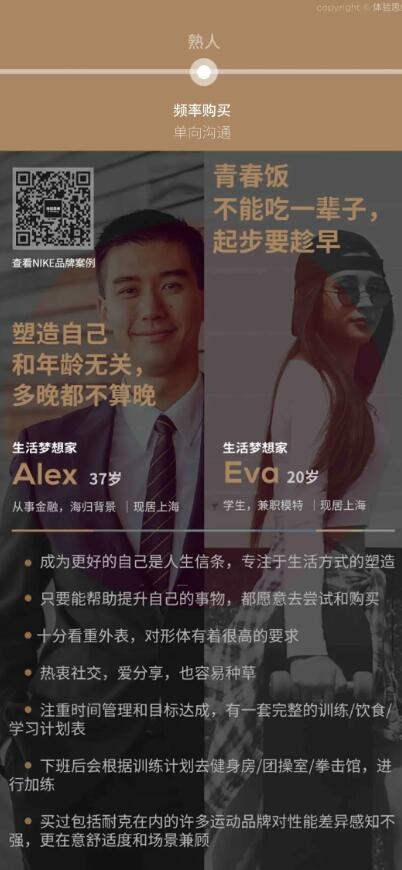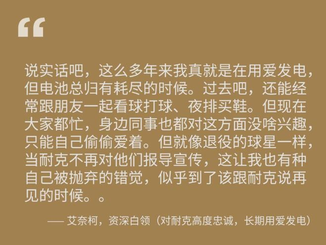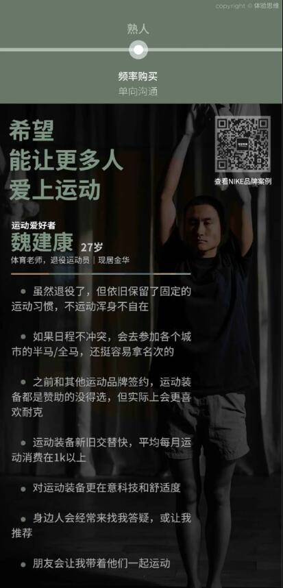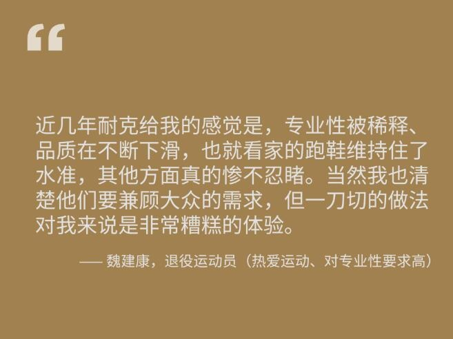 这些人作为耐克的长尾用户,虽然不具备像“未来合伙人”(种子用户)和“品牌老伙计”(先锋用户)这般的影响力。但基数够大的同时,有着可观的消费能力、隐藏的潜在消费需求, 以及对个人社交范围内亲友、同事的直接影响力。但事实上,他们的价值和需求都被耐克忽略了。