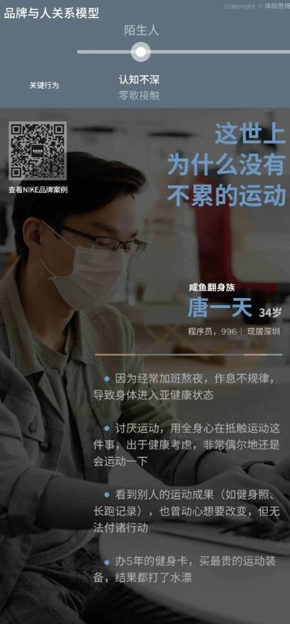“耐克死忠粉”、“运动爱好者”、“生活梦想家”、“咸鱼翻身族”,对这 4 类人群耐克和他们之间就像是有一道透明的真空带。人们明明可以看到耐克的一举一动,却无法触碰或往前靠近一步,甚至连心声(无论好坏)都无法传递。