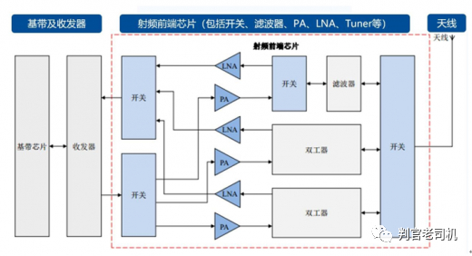 我上边说的这个过程是很粗糙的,方便大家理解,实际上这中间还有很多其他的元器件,比如电阻电容、滤波器、天线开关等。但整个工作流程大概就是这样。从网上找了张图,大家随便感受一下: