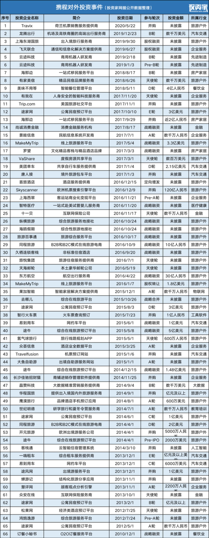 根据“某企业信息查询平台”数据显示,不完全统计,从2010年起至今,携程对外投资有66起之多,主要围绕旅游,投资范围涉及酒店、民宿、餐饮、租车、航空、金融等。