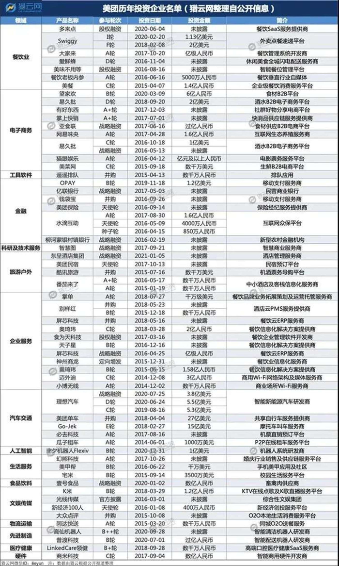 从猎云网整理的美团历年投资名单显示,奉行无边界扩张的美团一直围绕着人们的衣食住行拓展业务版图,因而,整体的扩张板块,也更为复杂多样,而每一个板块所受到的关注度,也理所当然地相应削弱。