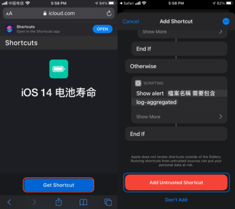 安装「iOS 14 电池寿命」脚本,只需在后台对话框中回复「027」即可获取脚本链接,将其用 Safari 浏览器打开,即可自动跳转到快捷指令 app 中按提示下滑到底部选择「加入不受信任的快捷指令」即可。