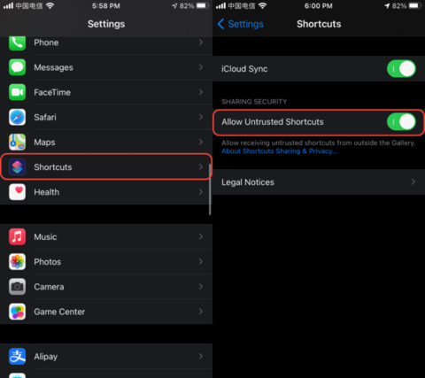 如果是首次安装还需要到「设置 > 快捷指令」中打开「允许不受信任的快捷指令」,如果没有这个选项或者这个按钮是灰色无法开启,这需要去快捷指令资源库中随便运行一个苹果官方的快捷指令即可激活这个开关。