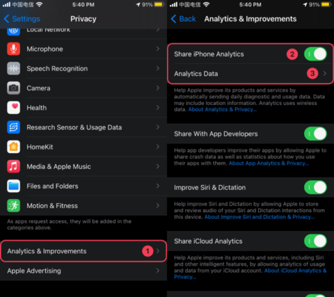 首先获取电池的使用信息,在「设置 > 隐私 > 分析与改进」中确保「分享 iPhone 与 Apple Watch 分析」已打开;
